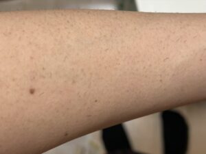 下は2回(2週間)での効果です。しっかり照射できている所と照射モレしている箇所で毛の伸び具合が変わってきました。この時に実感し始めました。